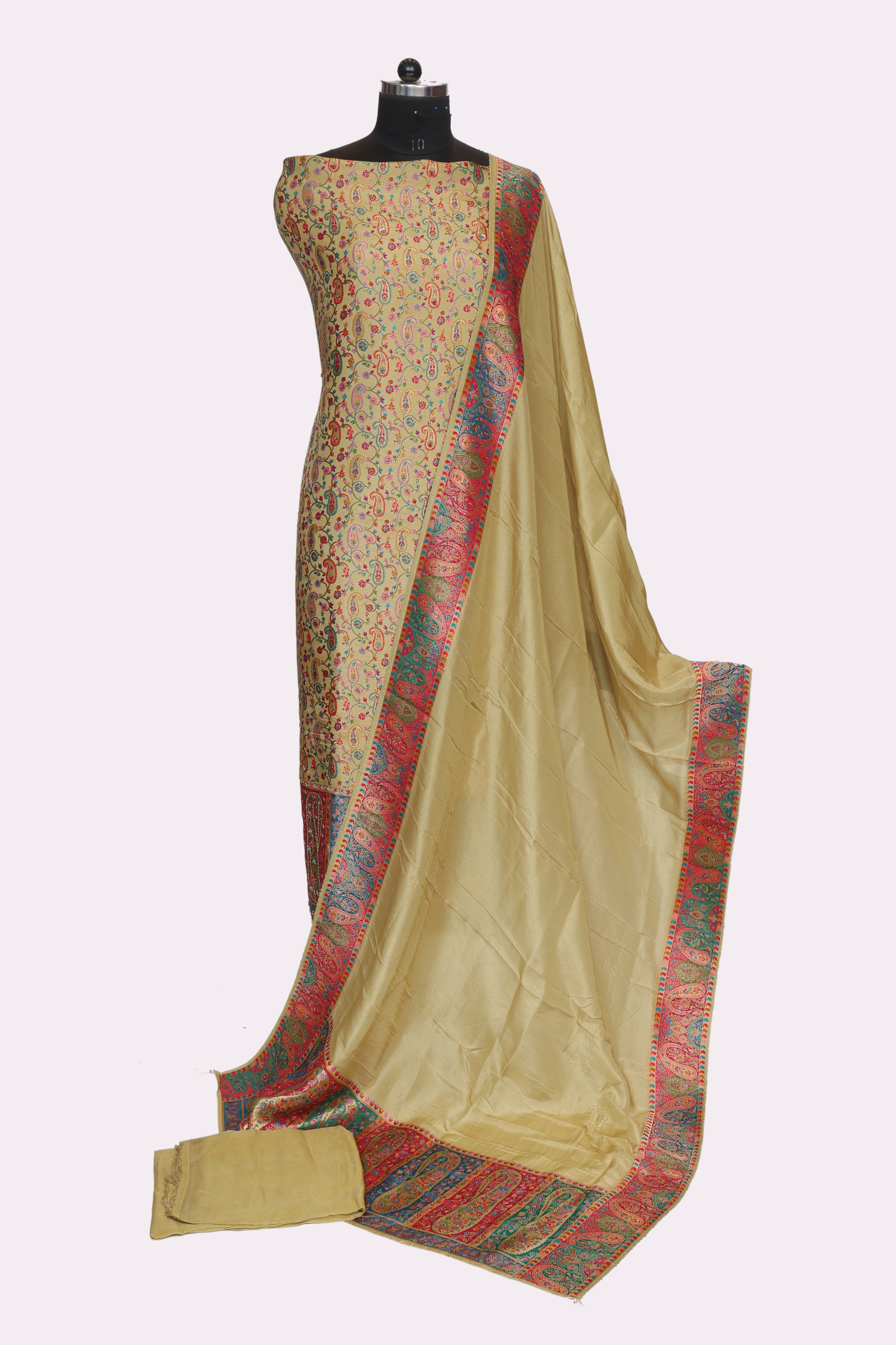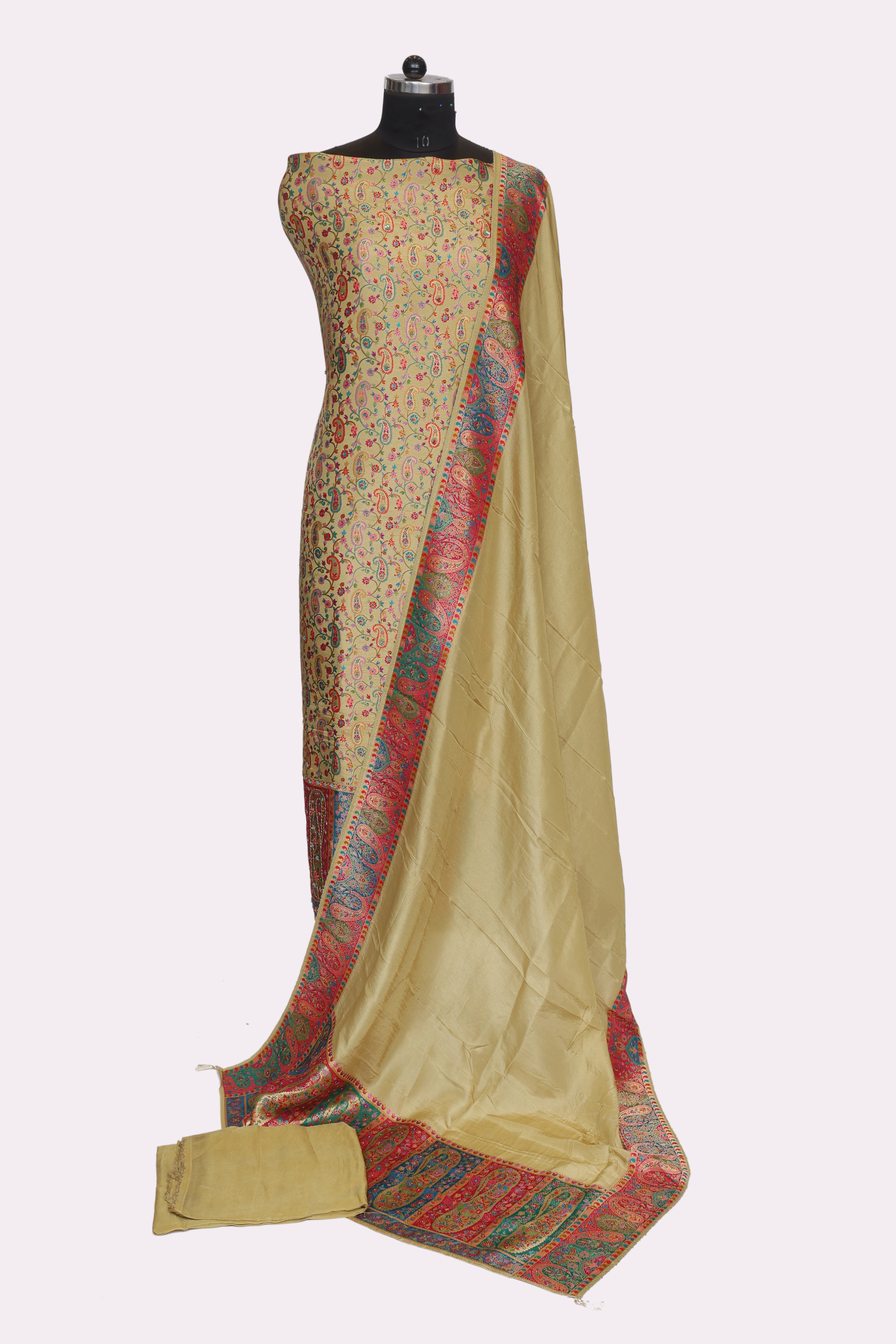 This suit material is made from pure silk in a soft Ghiya Green color. The shirt has Menakari weaving with...