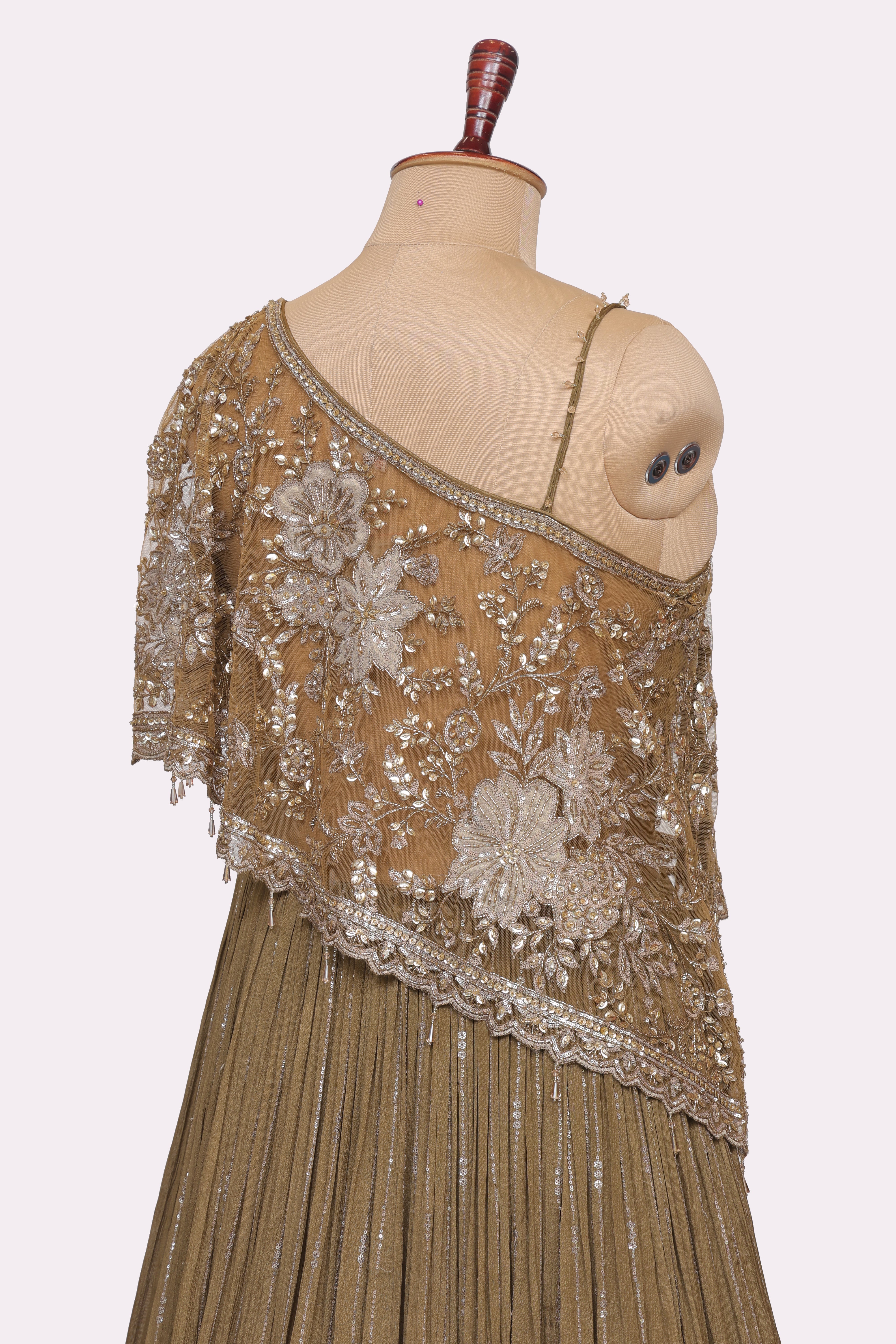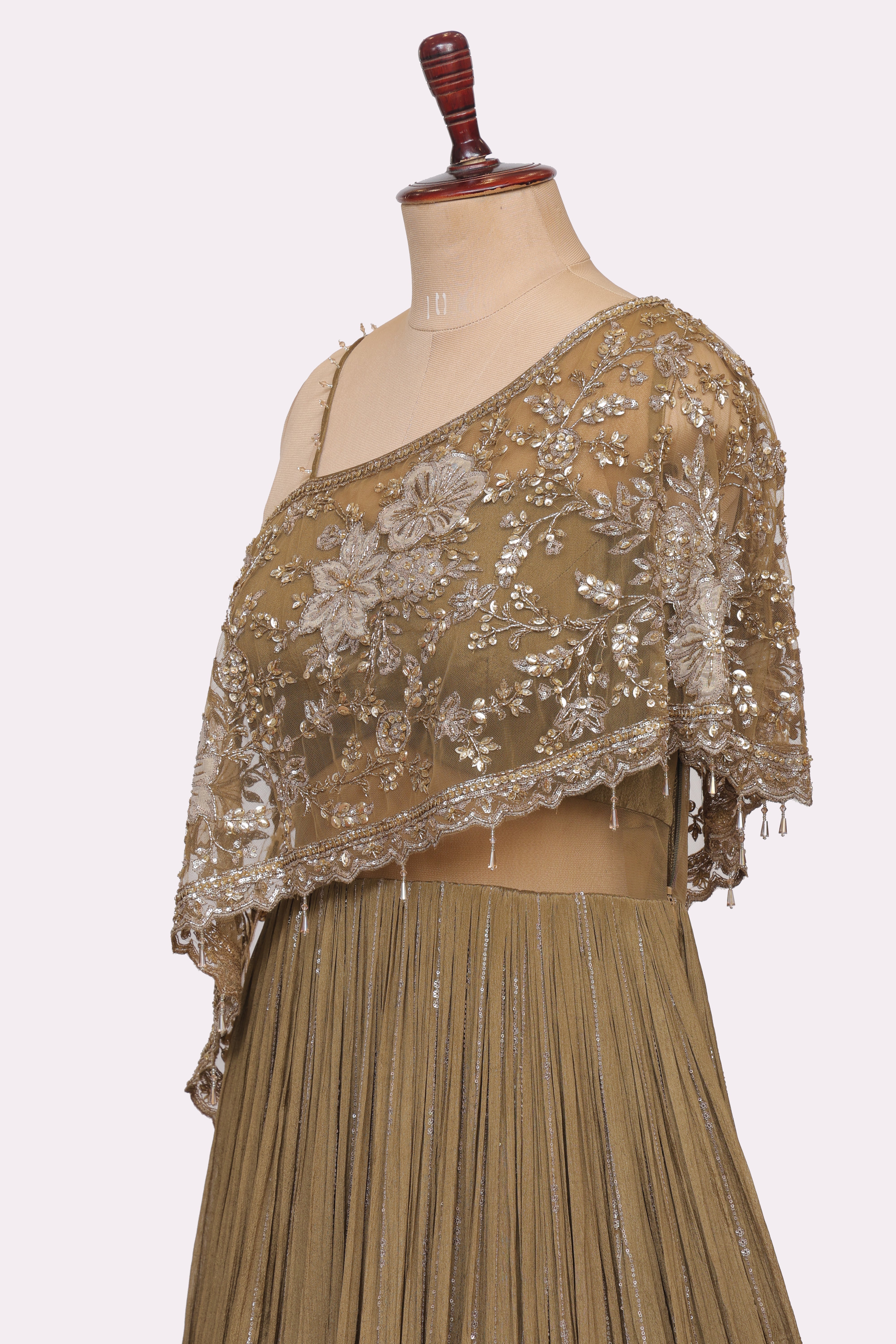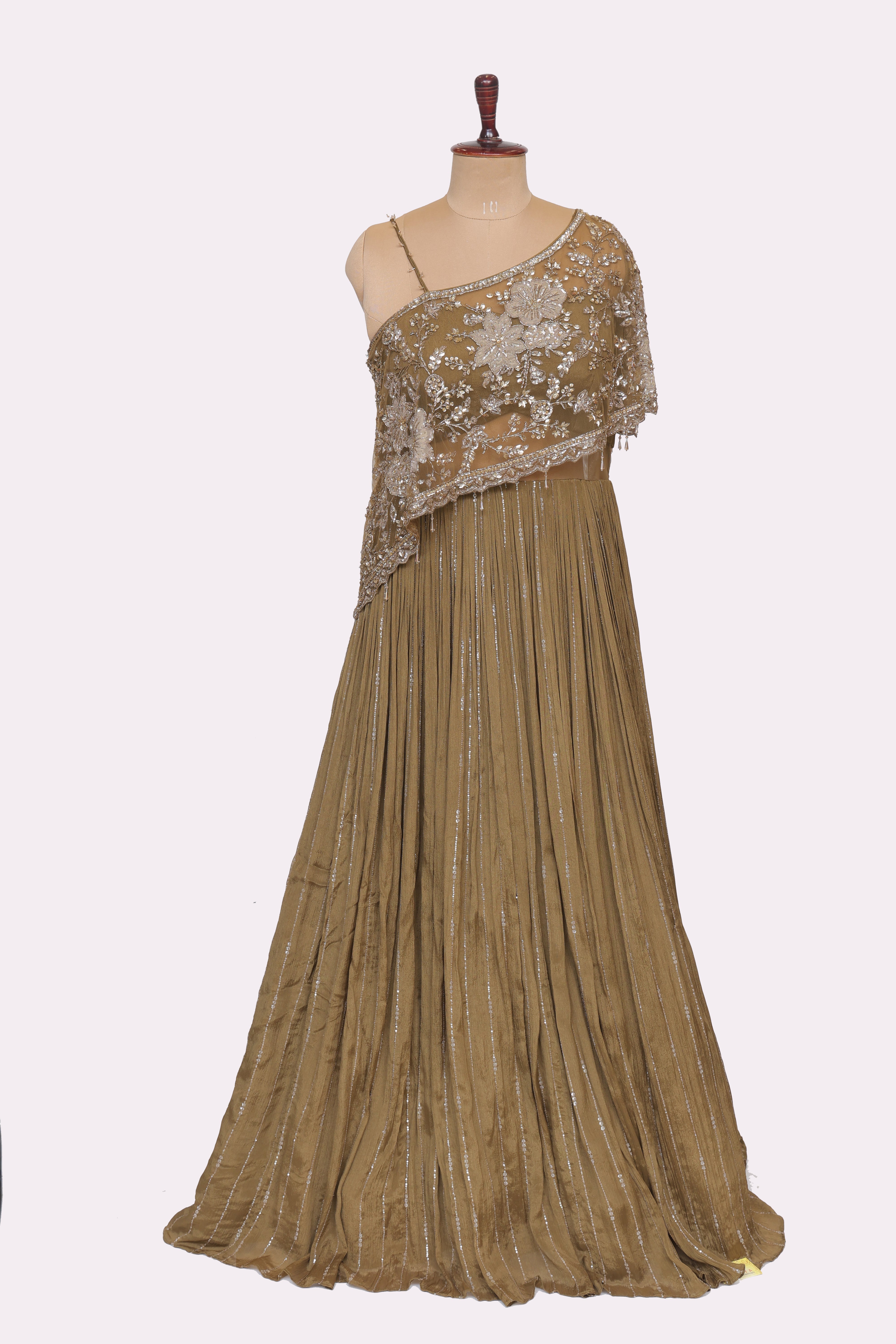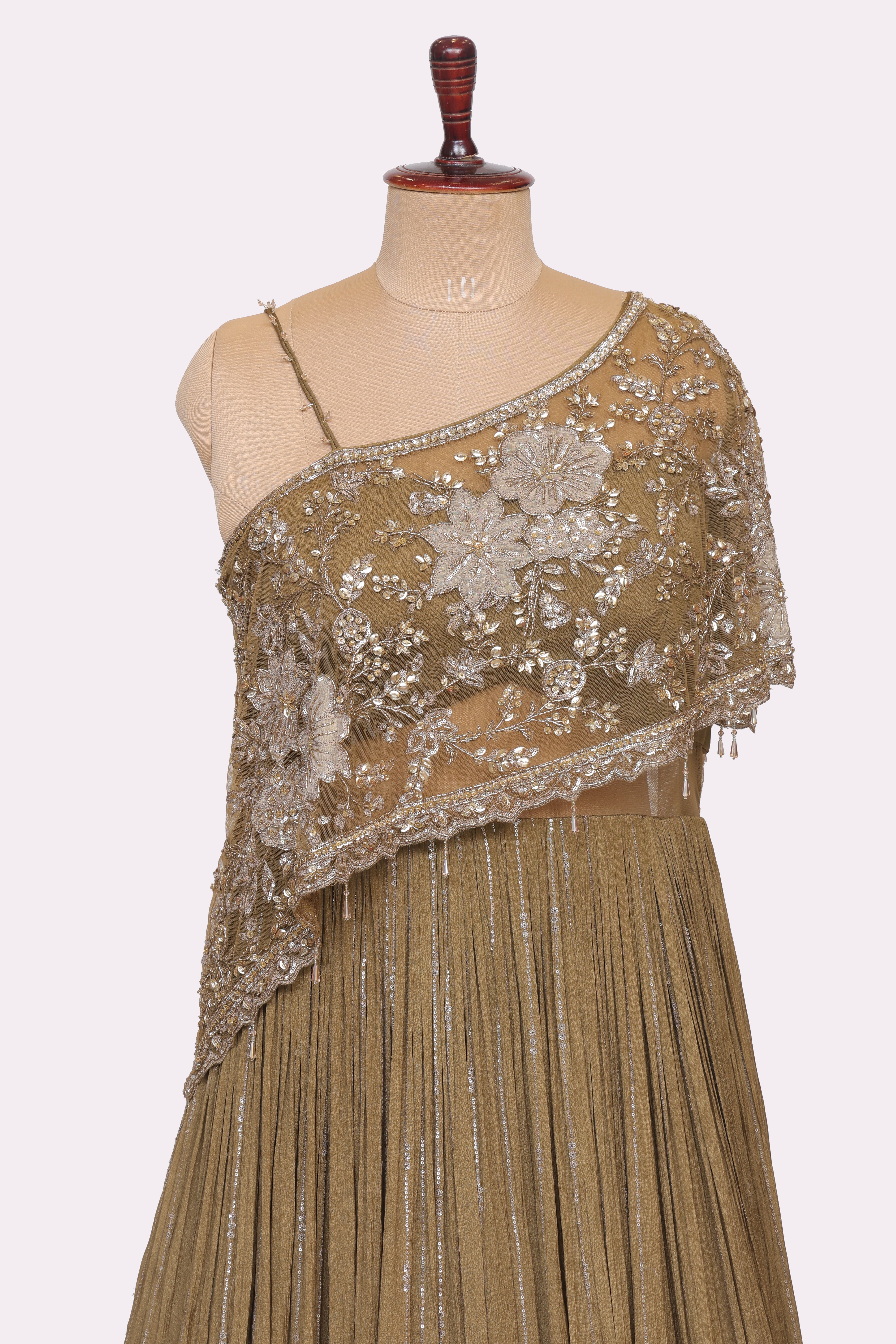 Mehendi Green Off Shoulder Gown with Attached Cape - Colour Mehendi Green - Size L, XL, XXL
