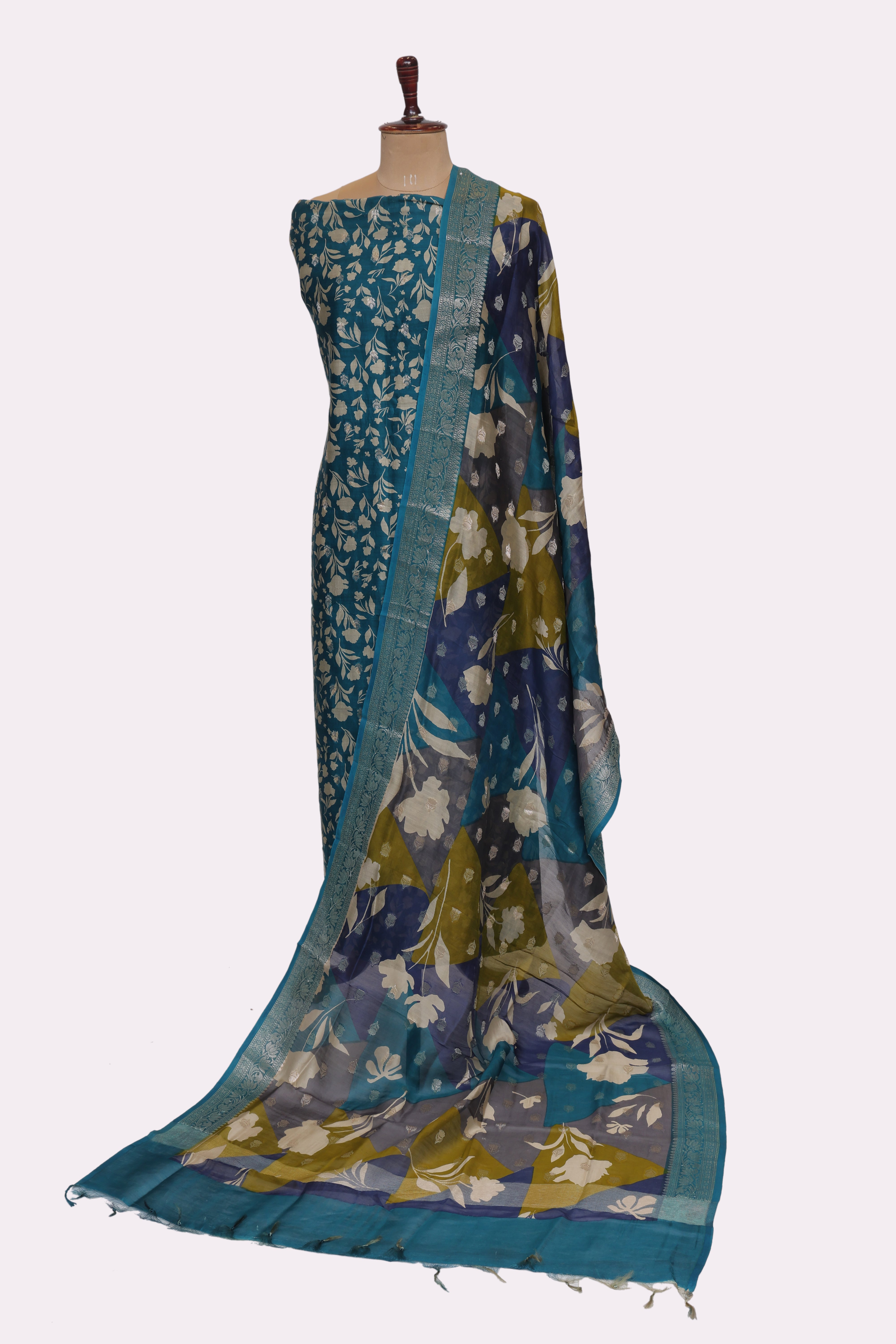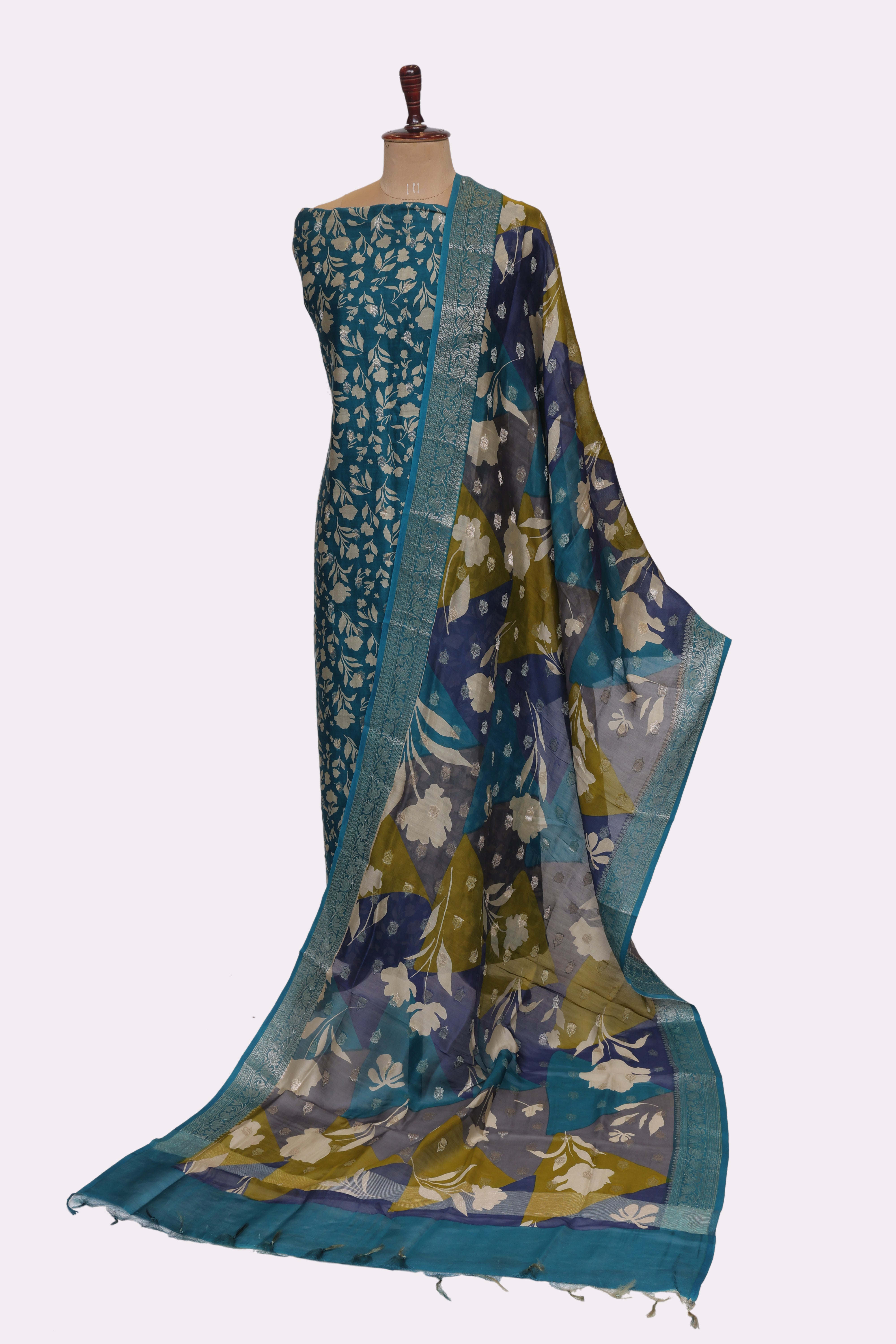 Pure Maheshwari Silk Suit Fabric with Kani Dupatta - Color Blue - Size REG