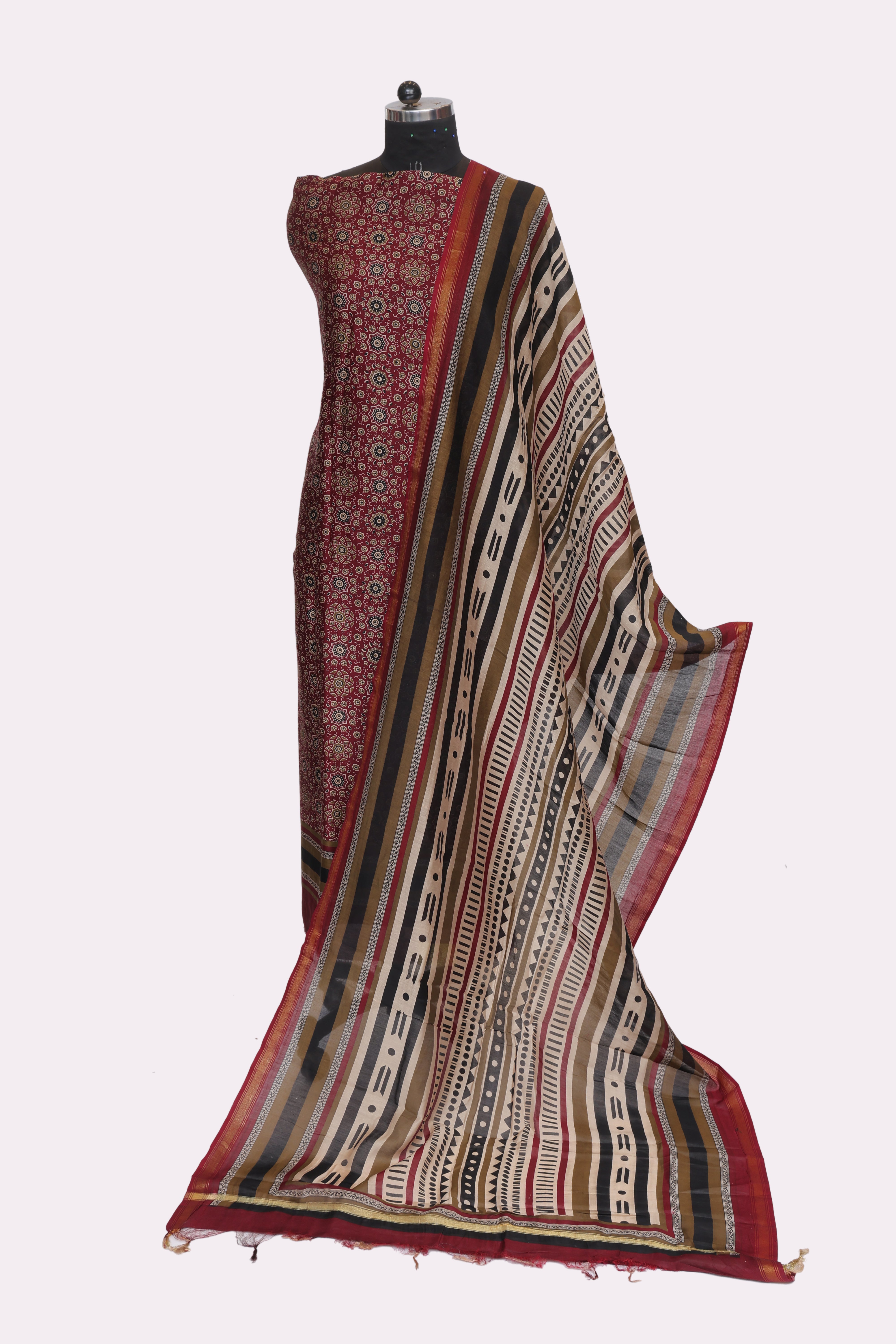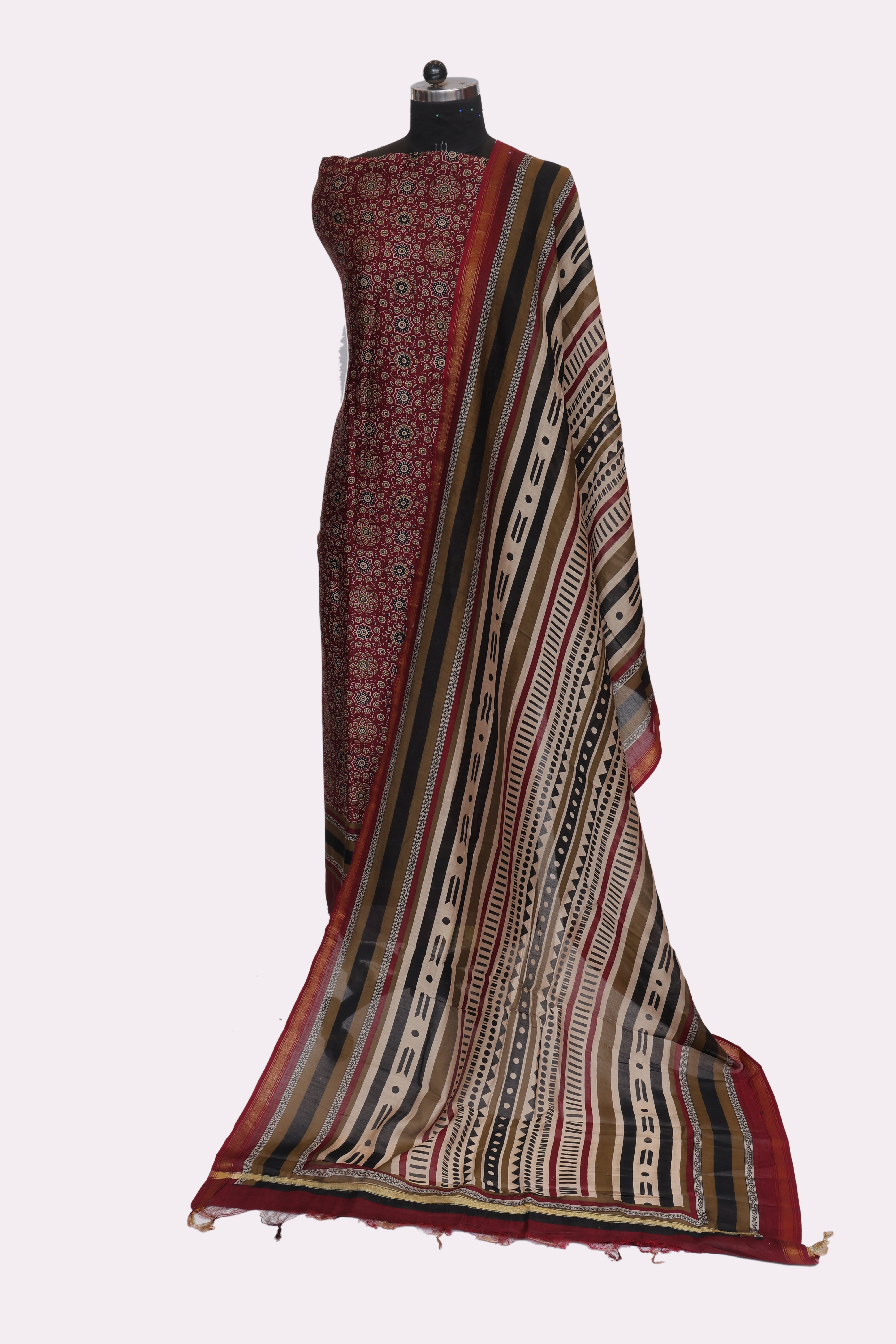 Pure Maheshwari Silk Suit Fabric with Ajrakh Print Shirt and Dupatta - Colour Mehroo - Size REG