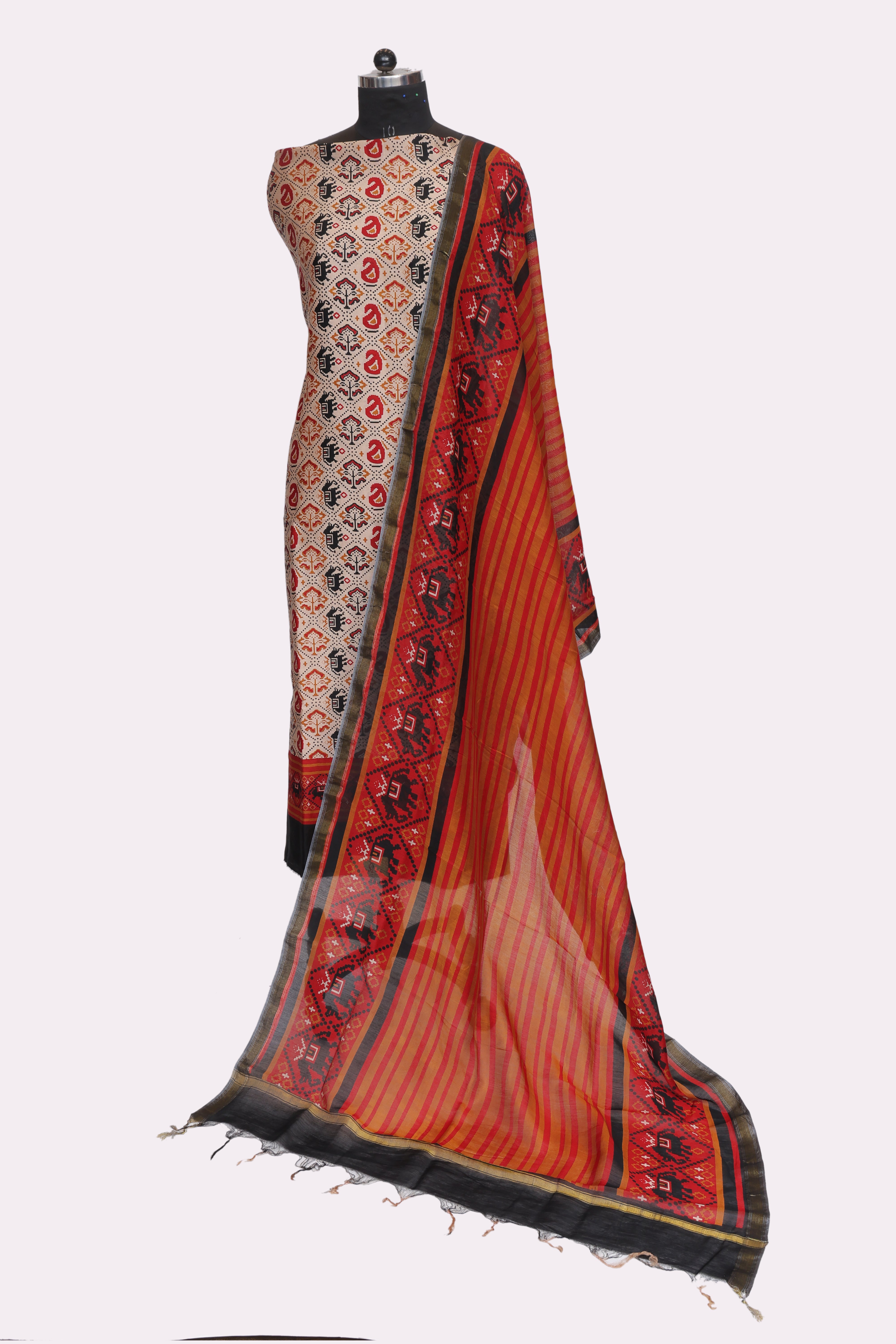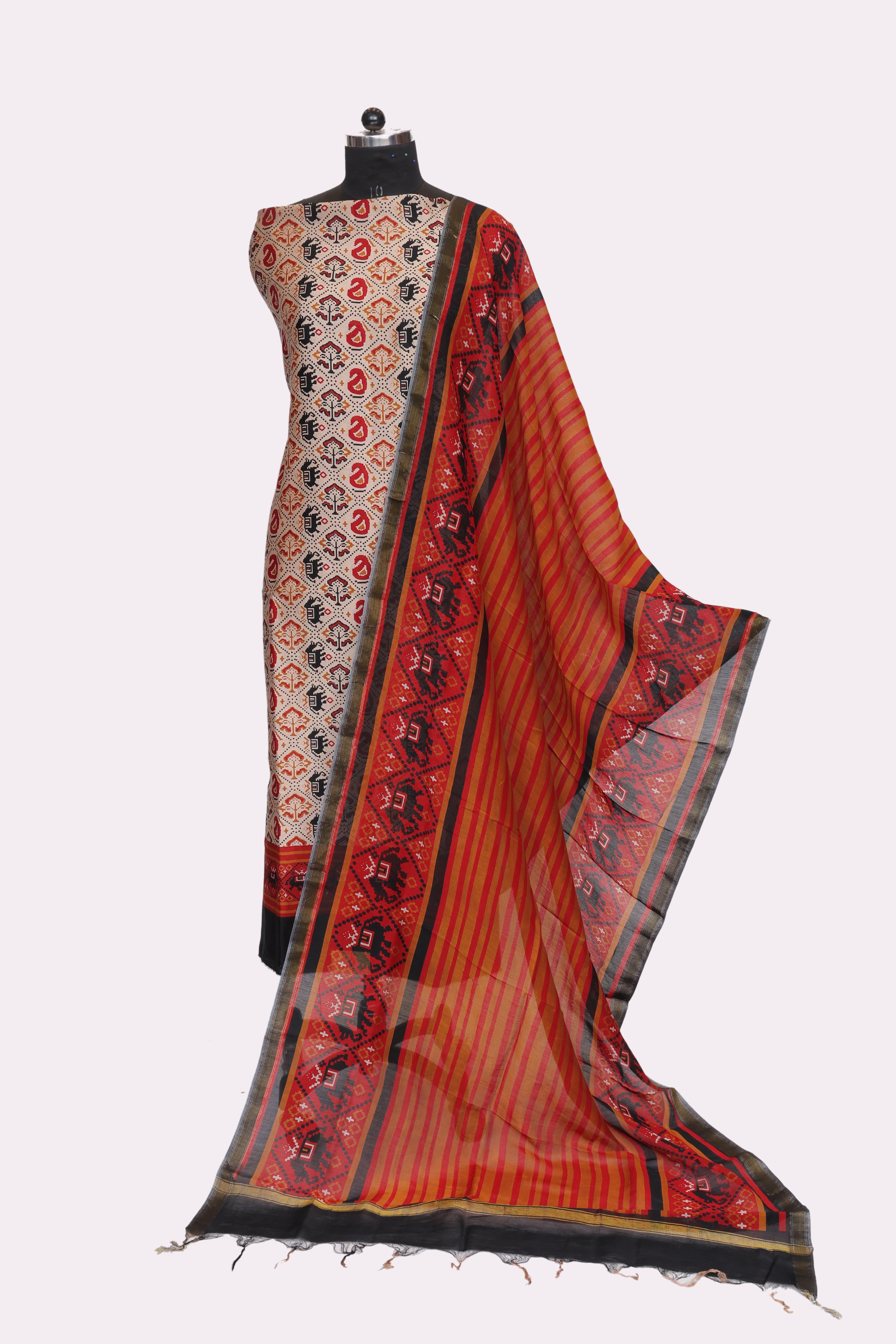 Pure Maheshwari Silk Suit Fabric with Patola Print Shirt and Dupatta - Color Red - Size REG
